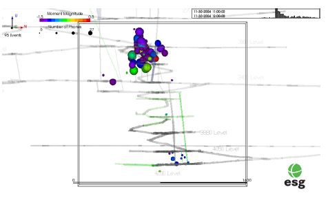 Creighton矿实施了在岩爆事件或大型生产爆炸后疏散矿区的程序,使用ESG的大型事件监测软件SeisWatch™来观察地震活动并隔离矿工的安全关注区域。